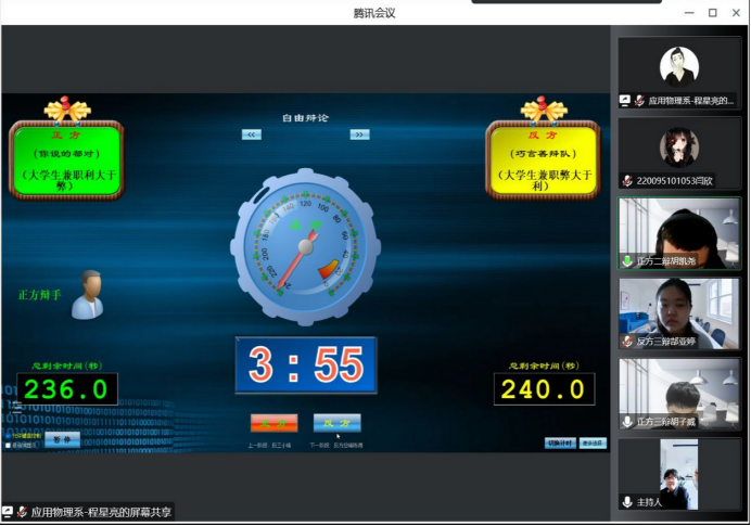 为了培养同学们的逻辑思考能力、语言表达能力,丰富学生的宿舍生活,理学院团委于2022年11月5日至17日在腾讯会议平台举办了辩论赛,此次比赛由窦一菡、程星亮主持,第十六届主席团成员以及理学院辩论队负责人范璐婷出席并担任本次比赛的评委。本次辩论赛共有10支队伍参赛,经过初赛的选拔,有4支队伍进入决赛。