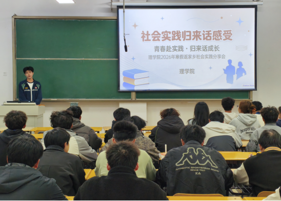 为进一步推动三全育人走深走实,深化实践育人成效,引领青年学子在社会实践中砥砺品格、增长本领、服务社会,理学院于3月26日,在观成楼104教室举办“社会实践归来话感受”——2026年寒假“返家乡”社会实践分享会,此次分享会以“青春赴实践·归来话成长”为主题,来自各年级各专业的同学齐聚一堂,听代表们分享实践故事,传递青春力量。