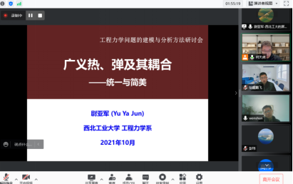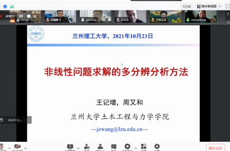 2021年10月23日,理学院工程力学系成功举办“工程力学问题的建模与分析方法研究”线上研讨会。来自兰州大学、西安交通大学、西北工业大学、兰州交通大学、兰州理工大学等高校的专家、学者、相关专业师生40余人参加了本次研讨会,与会代表就学科建设、学术研究及研究生培养与参会师生进行了深入广泛的交流和研讨。研讨会上,3位学者分别为大家在线做了精彩的学术报告。研讨会由理学院工程力学系何天虎教授主持。