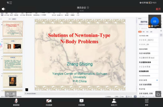 张世清教授和刘春根教授分别做了题为《Solutions of Newtonian-Type N-Body Problems》、《Index theory for linear self-adjoint operator equations and its applications》的精彩学术报告。报告结束后,两位教授就与会师生提出的相关问题作了详细的解答,同时就共同关心的话题,如基金申报,共同组织在线讨论班等问题进行了交流。通过此次学习交流,一方面让相关研究生了解了当前的学术前沿及热点,同时也加强了与同行之间的学术交流。