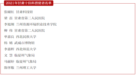 由省科技厅、省科协主办的2021年全国科普讲解大赛预选赛暨甘肃省第六届科普讲解大赛总决赛5月15日在兰州举行,经过激烈角逐,大赛评选出一等奖3名、二等奖7名、三等奖10名,优秀奖15名,专项奖3名,其中有10名参赛选手荣膺“2021年度甘肃十佳科普使者”称号,并享受了肩挂红色绶带的荣耀时刻,兰州理工大学理学院陈怀敬教师获此殊荣。
