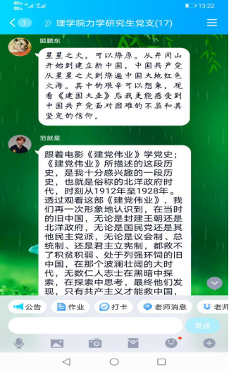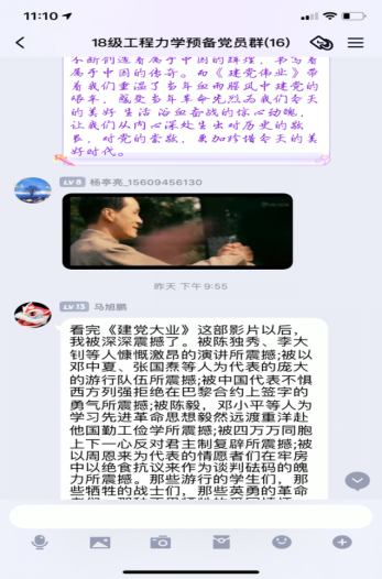 基础数学研究生党支部王波同志通过观看电影《铁人》感悟到:在科学技术日新月异和改革开放的今天,铁人精神又赋予新的时代内涵,具有鲜明的时代特征和重要的现实意义。力学研究生支部戚鹏程同志在观看《建党伟业》后表示,描述近代中国的发展和变革历程,通过观看影片,更加认识到今天的幸福是多么的来之不易。数学教师第二支部全体党员利用腾讯会议平台召开了观看《钱学森》研讨会,杨帆同志表示:有过出国访问经历的老师都会像钱学森那样更加热爱自己的祖国,更加努力为祖国做奉献。孟新友同志表示:钱学森勇挑国家重担的精神教育和激励我们。作为高校教师,不仅要培养好社会主义接班人,也要将自己的科学研究与国家需求想结合,这样才有更大的动力做研究,才能更好地服务社会和人民。