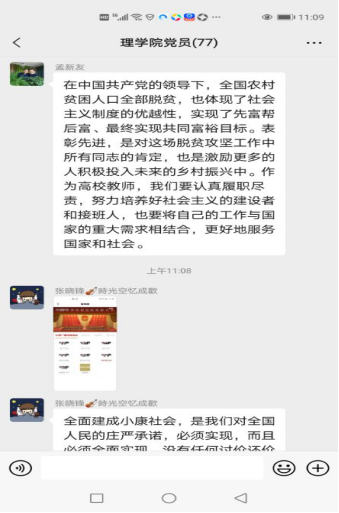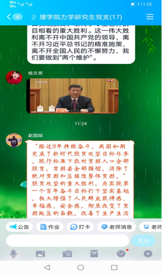 在中国共产党的坚强领导下,全国近1亿贫困人口全部脱贫,第一个百年梦想如期实现。在观看直播的过程中,理学院党委各党支部开展了热烈的讨论交流,大家有感于自己家乡面貌的改变、脱贫攻坚先进个人的感人事迹,同时结合脱贫攻坚主题电视剧《山海情》等畅谈对脱贫攻坚的感受。例如力学研究生支部曹晨曦表示:对脱贫攻坚的感受在于家门口越来越多来自农村的农贸产品在出售。从农民们的言语中感受到农村现在路修的好了,种地种菜养猪养鸡有人指导帮扶了,日子也越来越好了。本科生物理支部徐顺芳表示消费扶贫让贫困群众搭上了快车,让群众的腰包鼓起来了。教师党员张晓锋表示全面建成小康社会,是我们党对全国人民的庄严承诺,必须实现。理学院党委李建东书记表示:历史伟业充分体现了集中力量办大事的体制优势和中国共产党人咬定青山不放松的精神品格。我们一定要紧密团结在以习近平同志为核心的党中央周围,继承发扬好脱贫攻坚精神,紧紧围绕立德树人根本任务,努力培养德智体美劳全面发展的时代新人,为建设现代化国家做出应有的贡献。