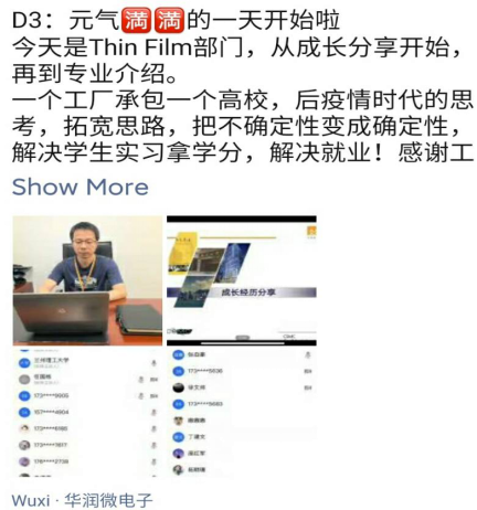 受疫情干扰及华润微电子承担国家防疫任务的情况,无锡华润微电子制造中心于2020年7月13日至7月17日为应用物理专业学生展开了为期5天的线上实习项目。华润微电子制造中心HR总监高鹏飞先生为同学们介绍了华润集团和华润微电子的历史发展和现状,制造中心的多位高级主管和工程师为同学们介绍了半导体制造的流程和工艺。