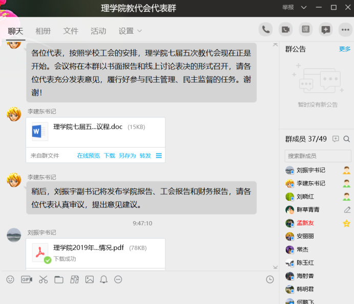2020年3月24日下午,理学院通过书面报告和线上交流的形式召开了2020年二级单位教职工代表大会。会议以习近平新时代中国特色社会主义思想为指导,深入学习贯彻党的十九大和中国工会十七大精神。审议通过了学院院长欧志英代表学院所做的2019年学院行政工作报告及2020年工作计划,学院工会主席刘振宇所做的工会工作报告,学院财务工作报告。理学院所有教代会代表参会。
