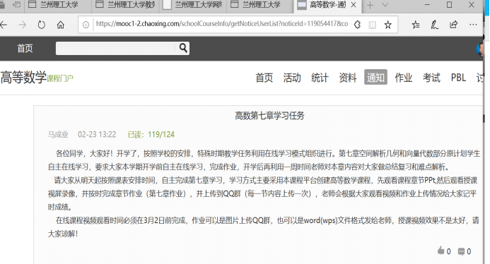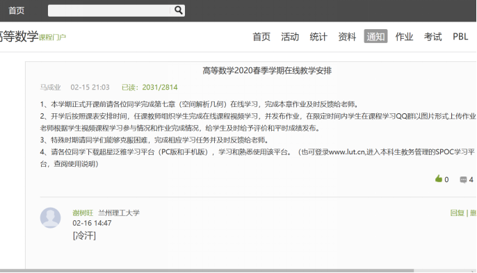 根据学校统一部署要求,万众一心落实“停课不停教、停课不停学”,开展疫情防控期间本科教学工作。理学院应用数学系承担全校量大面广数学类课程,由于课程涉及教师和学生人数比较多,因此系领导按照学校和学院的要求,积极安排部署实施课前准备工作,群策群力,动员老师们积极熟悉和准备网上教学相关工作。首先在超星泛雅在线平台自建和完善《高等数学》和《线性代数》在线课程,制定授课计划,讨论课程实施方式,不断地优化和完善课程平台,完成了课前准备工作。