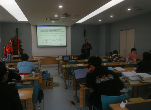 张彬林教授报告的题目为“On Kirchhoff-type fractional Laplacian problems with magnetic fields”。张教授首先介绍了分数阶拉普拉斯问题的研究背景;继而指出分数阶拉普拉斯问题与经典的整数阶拉普拉斯问题之间的本质差异,进而说明研究分数阶拉普拉斯相关问题是非常有必要而且具有重要意义;接着,通过具体讨论一类带磁场的基尔霍夫型分数阶拉普拉斯问题基态解的存在性,张教授指出了研究该类问题时需要克服的关键难点。最后,张教授结合自己科研经历,鼓励研究生要积极地关注自己研究方向的热点问题并要大胆的尝试。报告结束后,张教授就与会师生提出的相关问题作了解答。