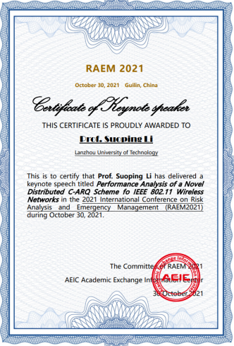 本次会议由香港风险管理及安全学会主席、香港科技大学Vincent Ho教授担任大会荣誉主席,兰州理工大学黎锁平教授、大连理工大学安辉教授、 山东大学吴建清教授共同担任大会主席。黎锁平教授还应邀作了题为“Performance Analysis of a Novel Distributed C-ARQ Scheme fo IEEE 802.11 Wireless Networks”的大会邀请报告。随机系统优化与控制团队成员和研究生积极参加了本次会议。会议所录用的文章将由IEEE CS 出版社以会议论文集的形式出版,并在出版后提交EI Compendex、Scopus 收录检索。