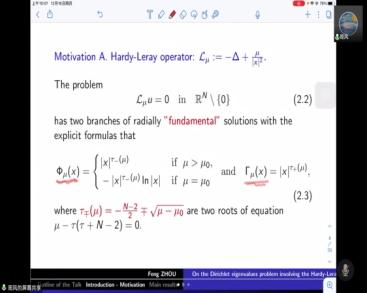 周风教授做了题为《On the Dirichlet eigenvalues problem involving the Hardy-Leray potential》的精彩学术报告。报告结束后,报告人详细解答了师生提出的相关问题,并就疫情期间共同关心的话题进行了交流。通过此次学习交流,一方面让相关研究生了解了当前的学术前沿及热点,同时也加强了与同行之间的学术交流。