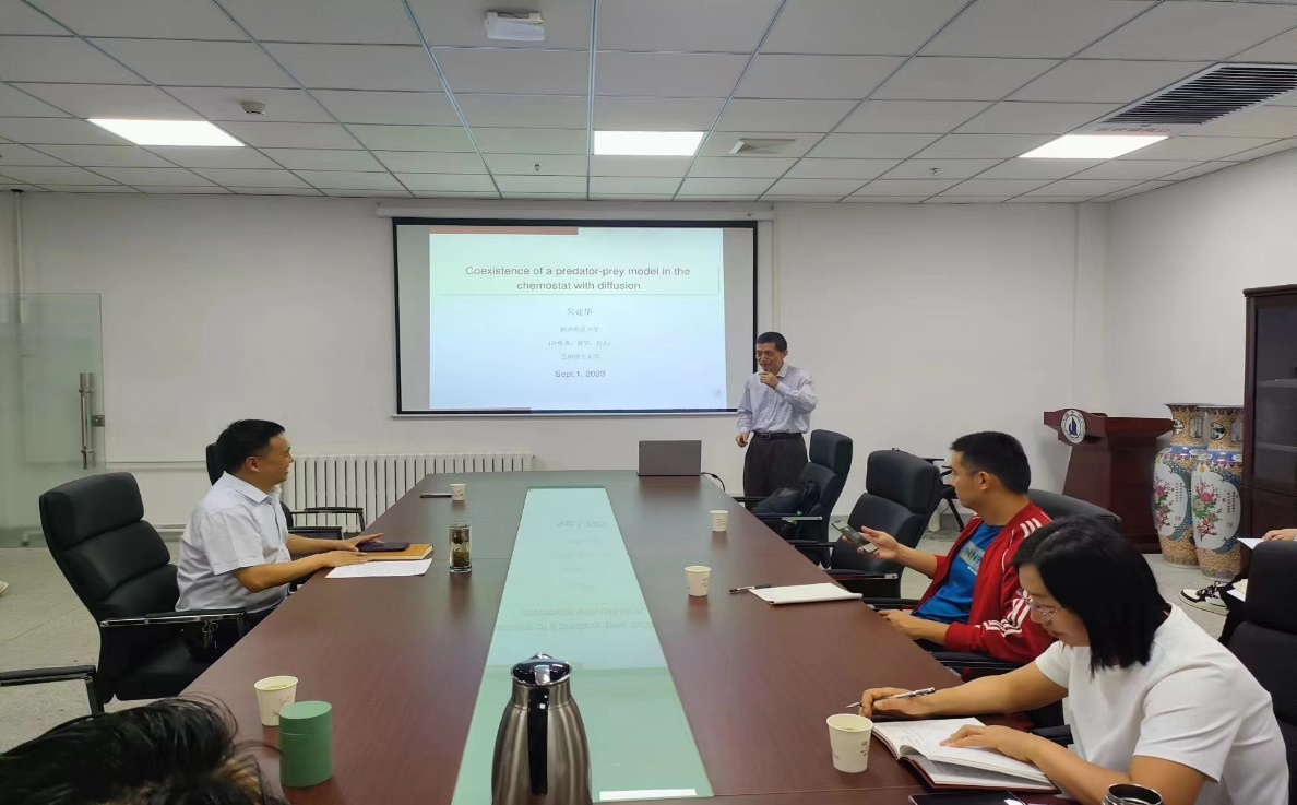 吴建华教授做了题为《Coexistence of a predator-prey model in the chemostat with diffusion》的精彩学术报告。报告结束后,吴教授详细地解答了师生提出的相关问题,并且就共同关注的热点问题、研究生培养等展开了探讨与交流。通过此次学习交流,让在读的研究生了解了当前的学术前沿及热点,同时也加强了与同行之间的学术交流。